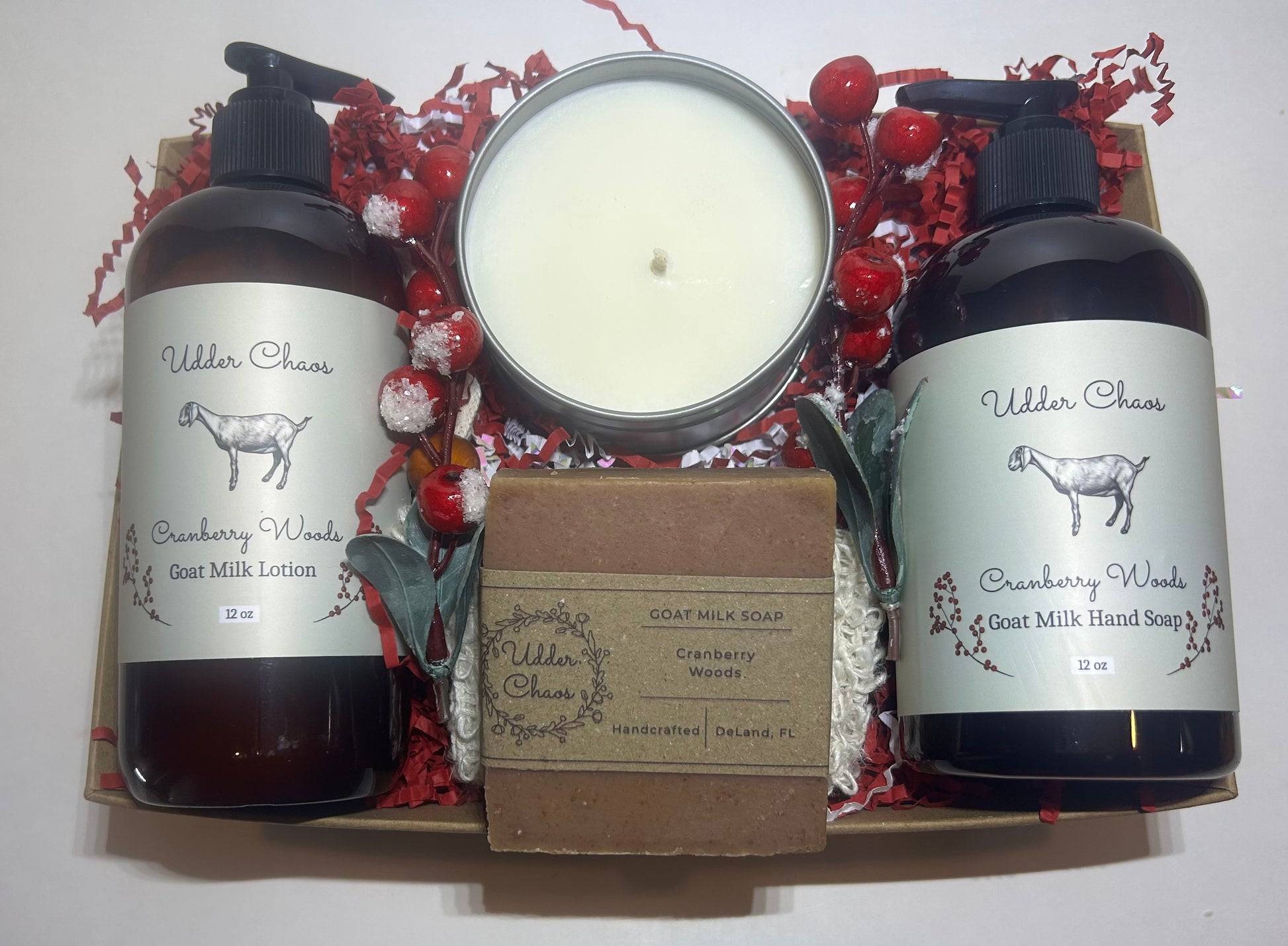 This basket includes everything you need to spread Christmas cheer all around your home. One 12 oz goat milk lotion, one 12 oz goat milk hand soap, one 4.5 oz coordinating bar of soap and one 8oz coordinating candle.